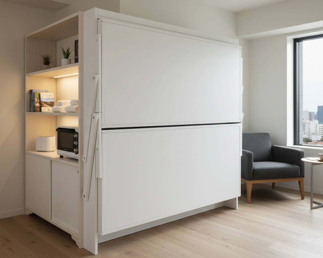 The bunk bed "Apri" contains mattresses that are slightly smaller than the standard sizes, firstly to make it fit into the wooden box, and secondly to allow its closure with the blankets for a perfect Murphy bed. Therefore, the ideal size for mattresses for this bed is 77x187 H17.