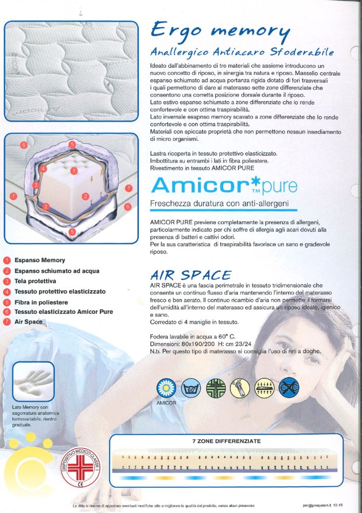 The lining is in AMICOR PURE fabric that completely prevents the presence of allergens, particularly suitable for those suffering from allergy to mites due to the presence of bacteria and bad smells. Thanks to its characteristic of breathability it produces a healthy and pleasant rest.