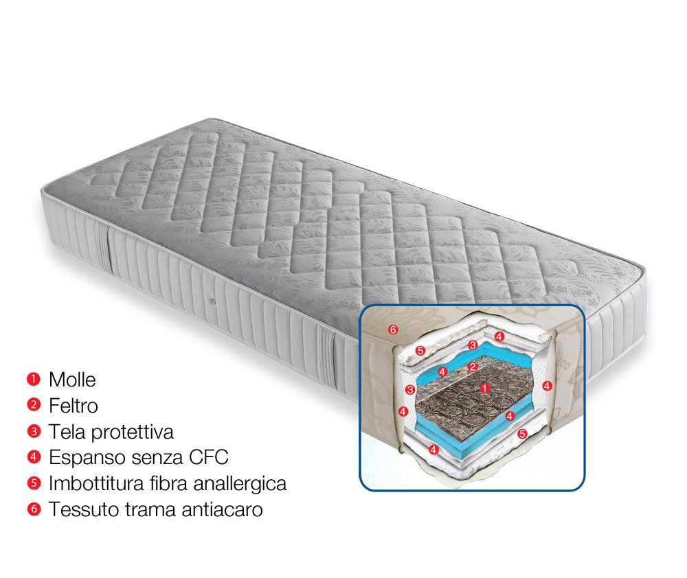 Sono i classici materassi di una volta, quelli che molti di noi ricordano dalle case dei nonni. All’interno contengono molle disposte in verticale e collegate tra loro da una rete metallica. Questa struttura fa sì che, quando si esercita una pressione su un punto, l’intera superficie del materasso si flette leggermente.