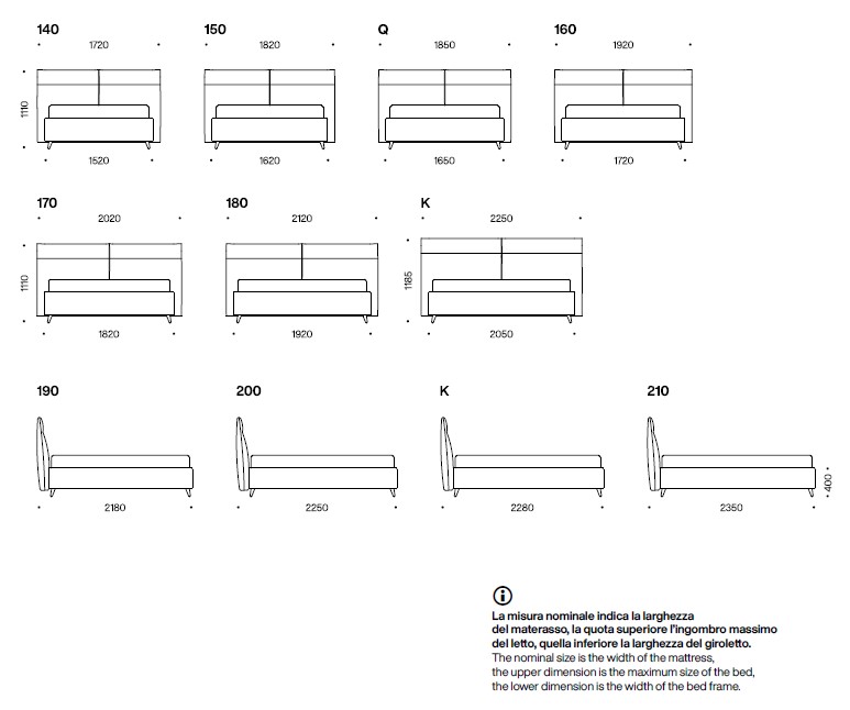 - Dimensioni di ingombro totali (cm): per la rete 160x200: L 189 x P 220 x H 109