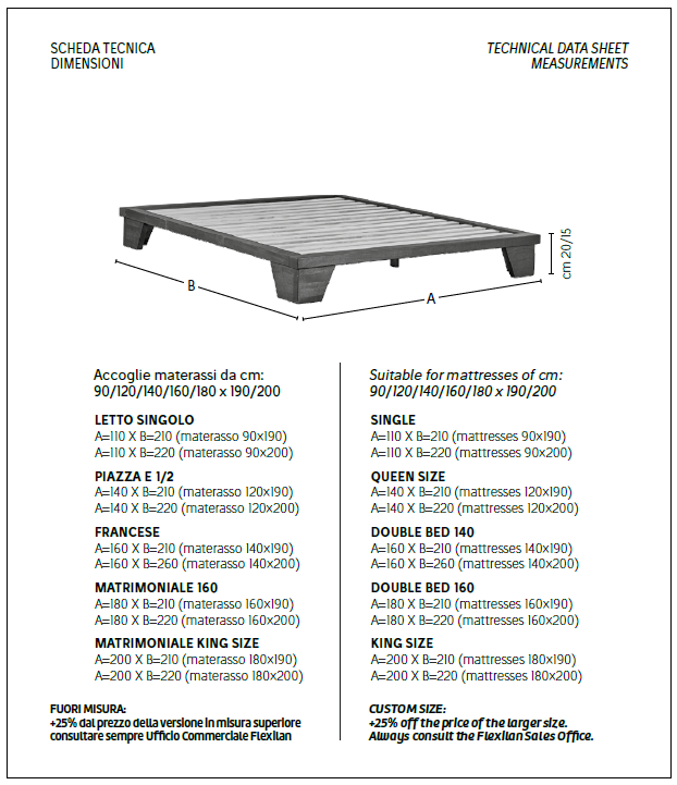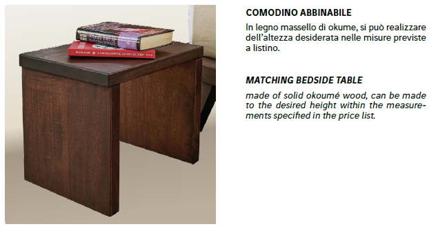 LA BASE LETTO è dotata di 14 listelli in massello di Okumè con spessore 1,5 cm, indeformabili e supportati da 2 barre e 4 piedi centrali. Tutto ciò permette il posizionamento di qualsiasi materasso: molle, molle indipendenti, memory foam e lattice.