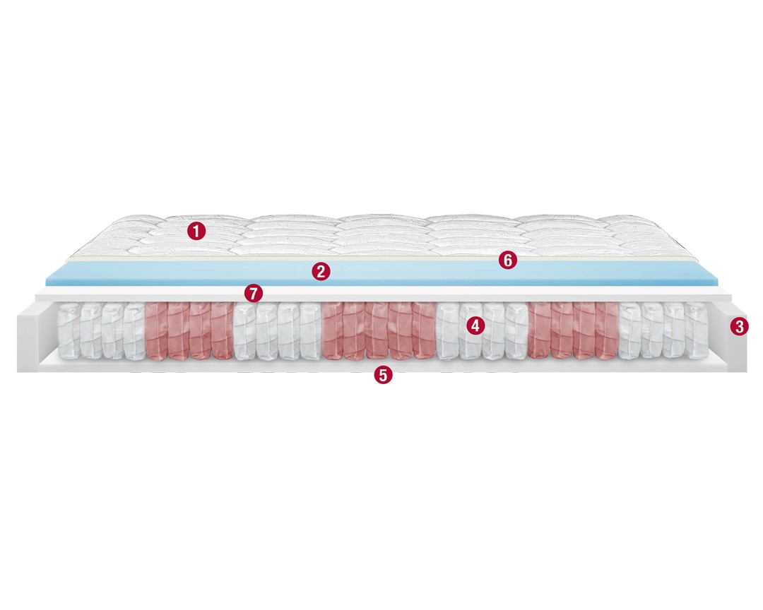 La struttura interna è composta da 1000 molle indipendenti, studiate per seguire in modo puntuale le forme del corpo e garantire un supporto ergonomico su tutta la superficie. Questo sistema favorisce una distribuzione uniforme del peso, migliorando la qualità del sonno e riducendo i punti di pressione.