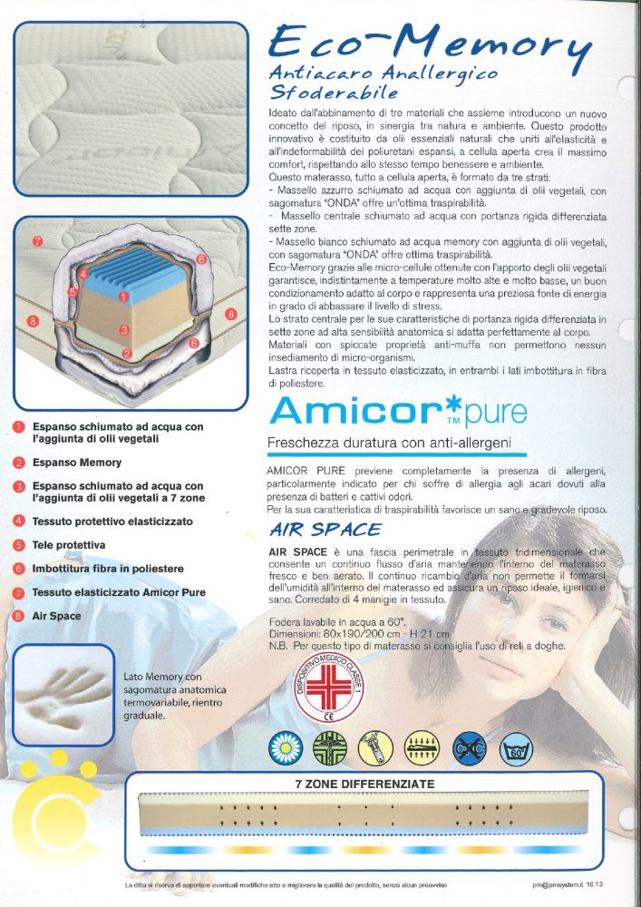 Eco-memory è ideato dall'abbinamento di tre materiali che assieme introducono un nuovo concetto di riposo, in sinergia tra riposo e ambiente. Questo prodotto innovativo è costituito da olii essenziali naturali che uniti all'elasticità e all'indeformabilità dei poliuretani espansi, a cellula aperta crea il massimo comfort, rispettando allo stesso tempo benessere e ambiente.