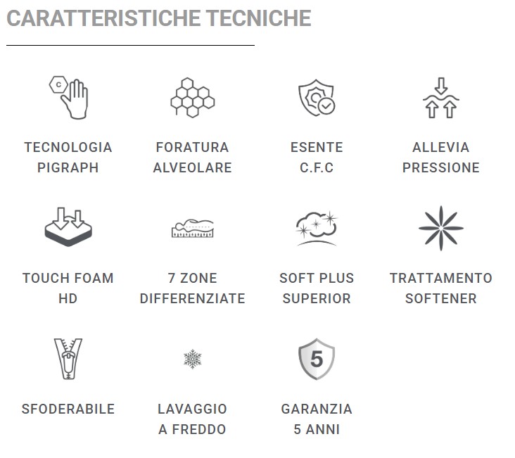 - Strato superiore (5 cm): PiGraph, innovativo PiFlex con particelle di grafite che disperdono il calore corporeo, ideale nei mesi caldi.