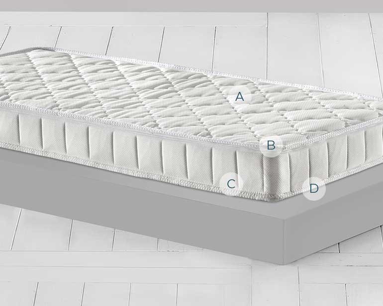 Il rivestimento è differente sui due lati del materasso. Da una parte è in viscosa, che rende il materasso morbido e setoso al tatto e ha una maggiore capacità di dissipare il sudore favorendo la traspirazione. Nell'altro lato il tessuto realizzato in fibra 3D traspirante favorisce il passaggio dell'aria anche all'interno del materasso.