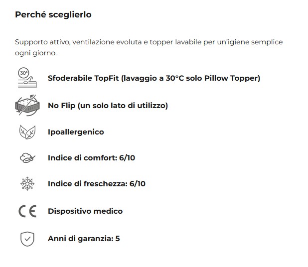 Il Pillow Topper, realizzato con fibre traspiranti e Myform Air, mantiene il piano di riposo ventilato e fresco anche nei periodi più caldi, favorendo un microclima costante.Il trattamento Fibersan, a base di oli essenziali naturali, aggiunge una protezione continua contro acari e allergeni, migliorando l’igiene quotidiana del materasso.