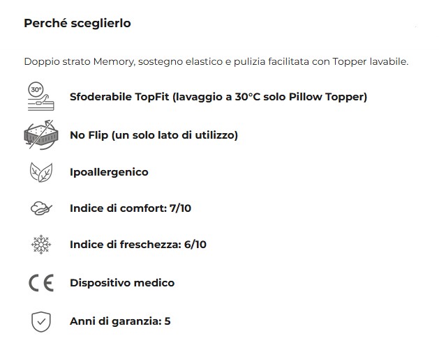 Il trattamento Fibersan, a base di oli essenziali naturali, protegge il materasso da acari e allergeni, mantenendo l’ambiente di riposo più sano nel tempo. Il risultato è un materasso evoluto ma immediato da vivere, che unisce tecnica, freschezza e una gestione quotidiana semplice e intuitiva.