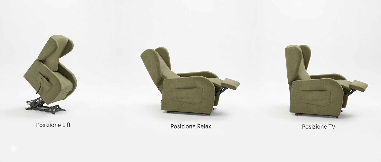 Dal punto di vista pratico, è sfoderabile, quindi facile da pulire e mantenere nel tempo. Il sistema LIFT alzapersona rappresenta un vero valore aggiunto: aiuta ad alzarsi senza sforzi, migliorando l’autonomia e il comfort quotidiano, soprattutto per persone anziane o con difficoltà motorie.